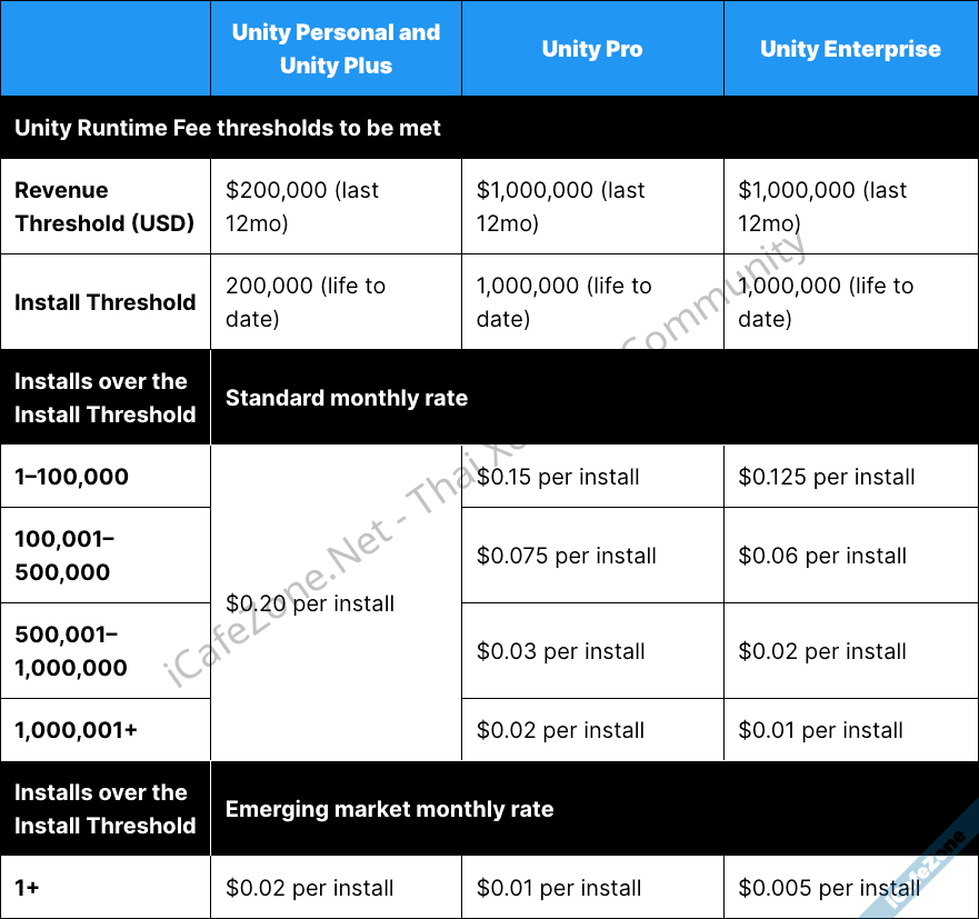 หากเข้าข่ายนี้ Unity จะเริ่มคิดเงินจากนักพัฒนาในราคา 0.20 ดอลลาร์ต่อการติดตั้ง (0.02 ดอลลาร์ หากลูกค้าที่เล่นเกมอยู่ในตลาดประเทศเกิดใหม่ ซึ่งรวมประเทศไทยด้วย) โดย Unity บอกว่ามีวิธีการนับจำนวนการติดตั้งเกมที่แม่นยำ สามารถตรวจจับเกมละเมิดลิขสิทธิ์ได้ด้วย (เพื่อไม่คิดราคาส่วนนี้) แต่ไม่เปิดเผยรายละเอียด