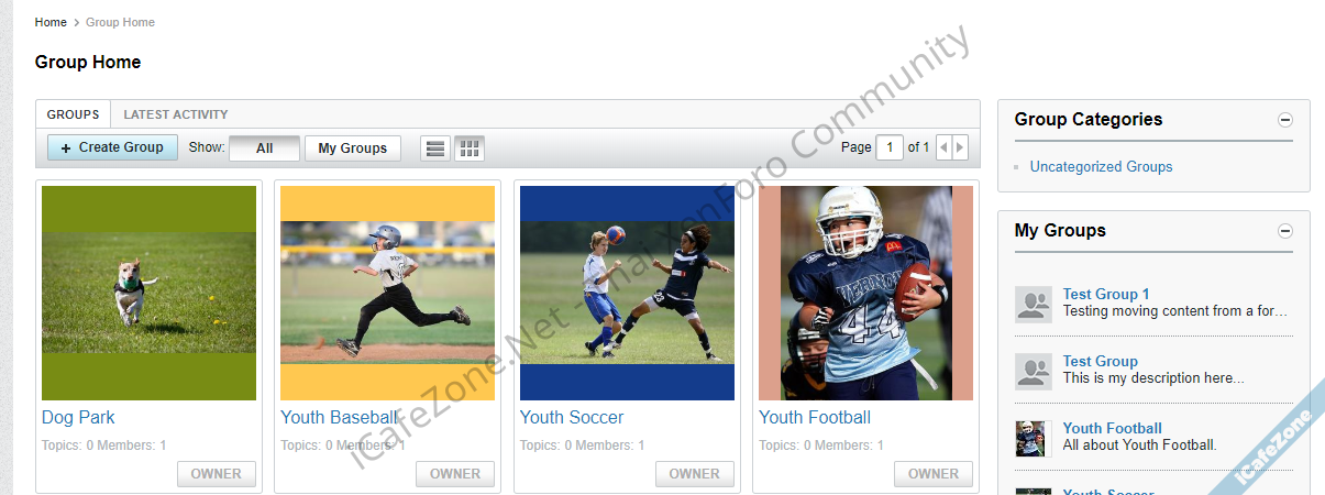 We have made a number of changes to the functionality of Groups. Many of these changes are centered around the display of Groups in order to bring more attention to the functionality. The display of Groups has been updated to support a grid-based card layout in addition to the current List layout. The new layout should encourage users to create their own groups and augment the content on your site.