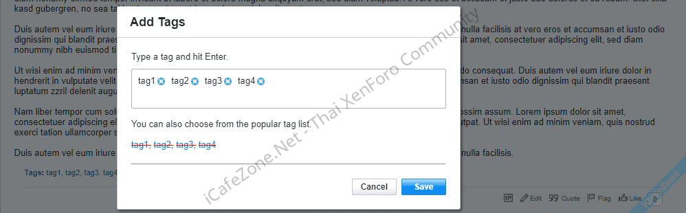 This will open a dialog to add new tags. If the user owns the Topic and has permission to modify Tags, they can delete tags added by others.