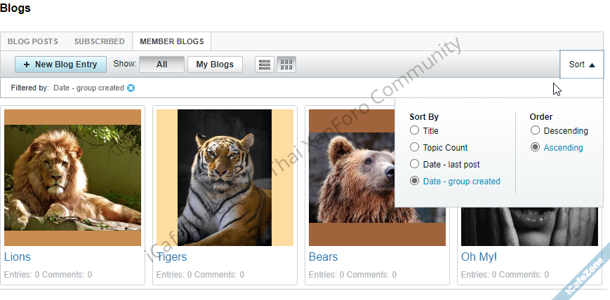 The grid view has been added to the Blog Listing. This works similarly to the grid view on Groups. In addition to this, sorting functionality has been added to the Blog Listing.