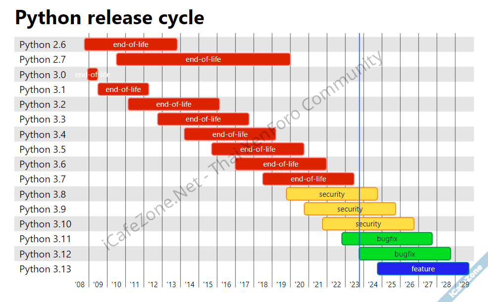 แนวทางของ Python นับตั้งแต่เวอร์ชัน 3.9 เป็นต้นมา คือออกรุ่นใหม่ทุกเดือนตุลาคมของทุกปี ซัพพอร์ตนาน 5 ปี โดย Python เวอร์ชันล่าสุดคือ 3.12 เพิ่งออกเมื่อต้นเดือนนี้ ข้อมูลการซัพพอร์ตแบบเรียลไทม์สามารถดูได้จาก Python Versions