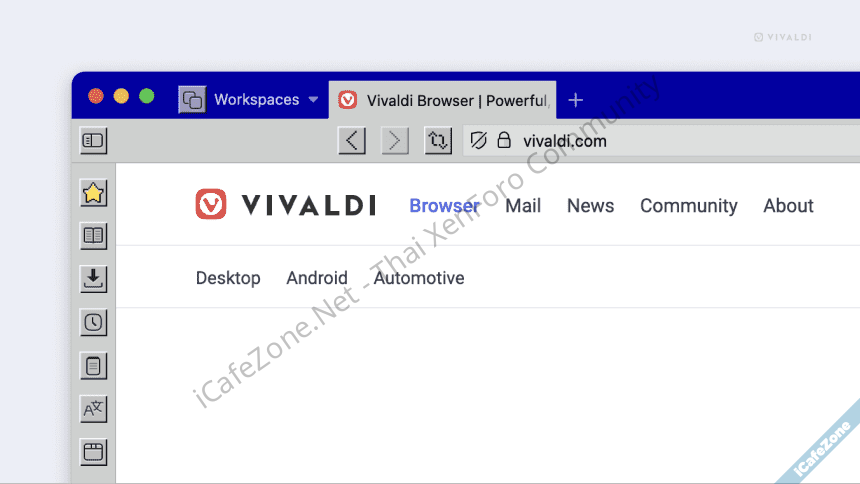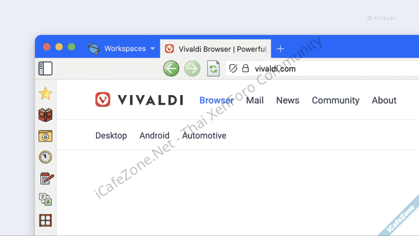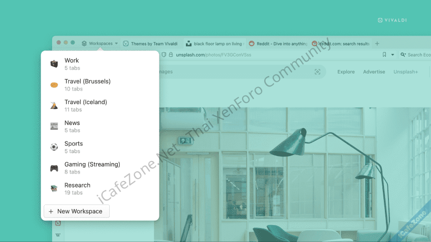 ฟีเจอร์อย่างที่สองคือ Workspace เป็นขั้นกว่าของการจัดกลุ่มแท็บ แนวคิดคล้าย virtual desktop ของ OS แต่อยู่ในเบราว์เซอร์เลย ผู้ใช้สามารถสร้าง Workspace สำหรับงานแต่ละประเภท เช่น Studies, Works, Personal โดยสลับไปมาได้ จัดธีมสีและไอคอนของแต่ละ Workspace ได้เอง โดย Workspace สามารถใช้ร่วมกับฟีเจอร์ Tab Stacks (tab group) ของ Vivaldi ที่มีอยู่แล้วได้ด้วย