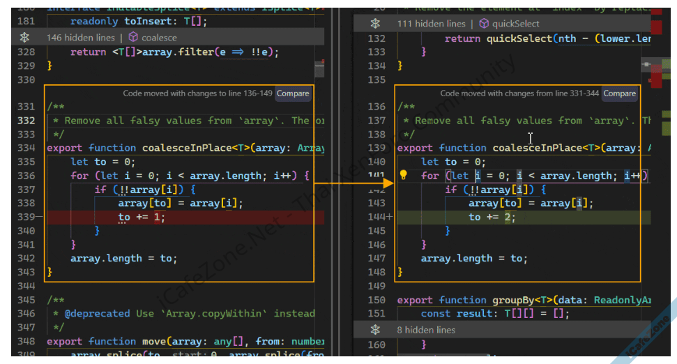 ของใหม่อย่างอื่นในเวอร์ชันนี้คือ Diff Editor ตัวใหม่ มีฟีเจอร์ตรวจจับโค้ดที่ย้ายตำแหน่งได้ (moved code detection) ช่วยให้เห็นการย้ายตำแหน่งโค้ดทั้งบล็อคได้ง่ายขึ้น
