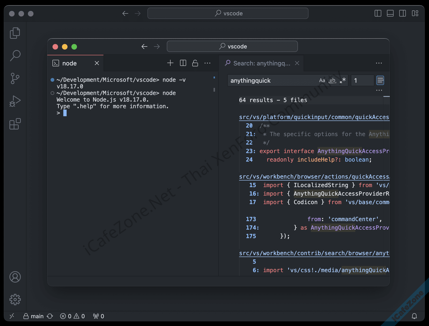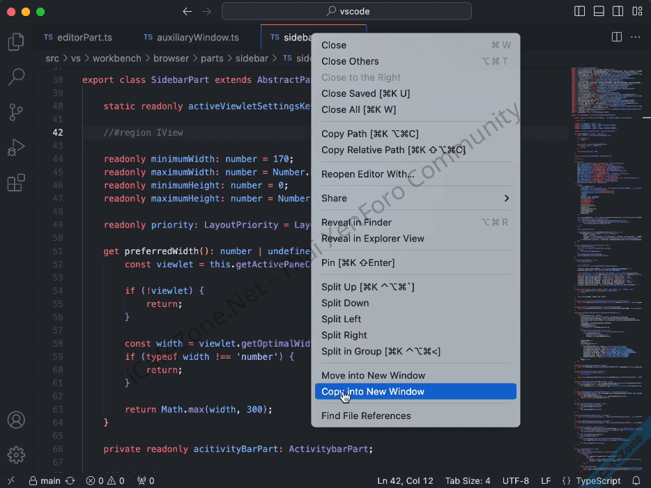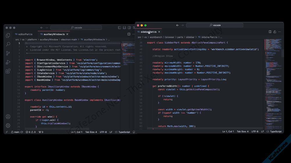 หน้าต่าง editor ที่แยกออกมาจะมีแต่ editor และแท็บเท่านั้น (ด้านขวาในภาพ) ไม่มีแถบเครื่องมือด้านซ้ายแบบเดียวกับหน้าต่างหลักของ VS Code (ด้านซ้ายในภาพ) แต่หน้าต่าง editor สามารถจัดเลย์เอาท์ภายในได้ตามต้องการ เช่น มี terminal หรือผลการค้นหาได้