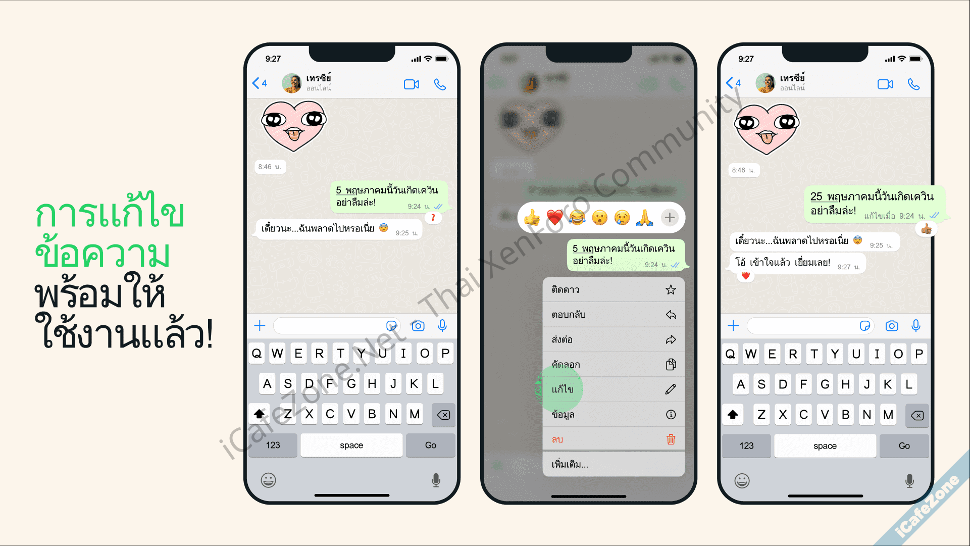 WhatsApp ประกาศเพิ่มคุณสมบัติใหม่ โดยผู้ใช้งานสามารถแก้ไขข้อความที่เพิ่งส่งออกไปได้ โดยมีเวลาให้แก้ไขได้ภายใน 15 นาที หลังจากข้อความนั้นส่งออกไป เพื่อรองรับกรณีสะกดคำผิด หรือต้องการใส่รายละเอียดเพิ่มเติมมากขึ้น วิธีการแก้ไขให้กดค้างบนข้อความที่ส่งไปแล้ว แล้วเลือกคำสั่ง Edit