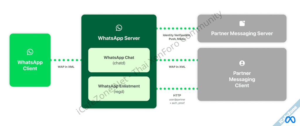รายละเอียดการเชื่อมต่อนั้น ผู้ให้บริการแชทที่เป็นพาร์ตเนอร์จะติดต่อกับเซิร์ฟเวอร์ของ Meta ด้วย HTTP และมีฟอร์แมตข้อความเป็น XML กระบวนการยืนยันตัวตน, พุช, และดาวน์โหลดไฟล์จะเก็บที่เซิร์ฟเวอร์ของผู้ให้บริการแชทเอง