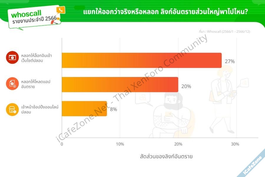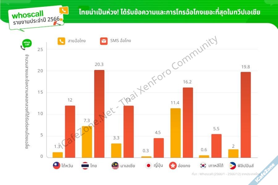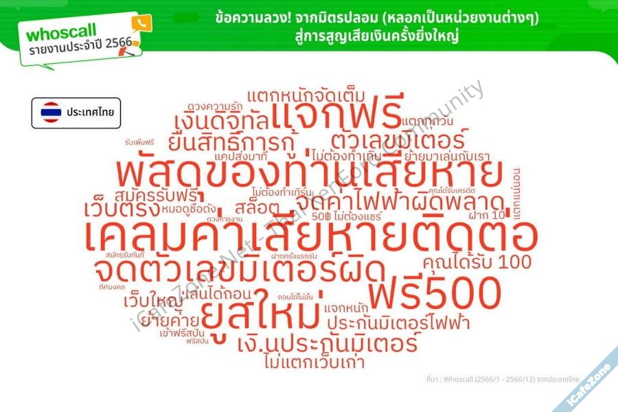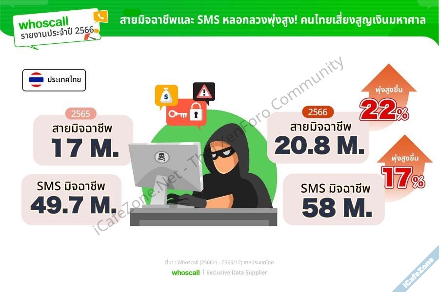 บริษัท Gogolook เจ้าของแอพ Whoscall ออกรายงานประจำปี 2566 สรุปสถิติว่ามิจฉาชีพหลอกลวงคนไทยผ่านทางโทรศัพท์และข้อความ SMS รวมทั้งหมด 79 ล้านครั้ง เพิ่มขึ้น 18% จากยอดรวม 66.7 ล้านครั้ง ในปี 2565