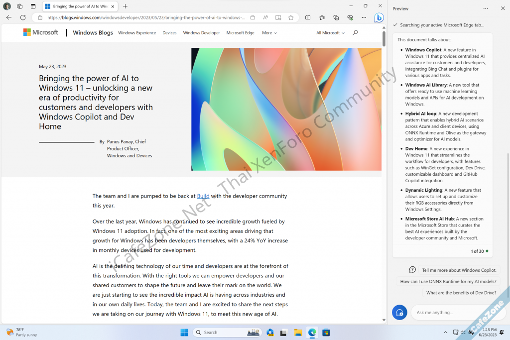 ไมโครซอฟท์เริ่มเปิดทดสอบฟีเจอร์ Windows Copilot หรือการใช้ Generative AI ช่วยสั่งงานต่างๆ ในระบบปฏิบัติการ ที่เปิดตัวในงาน Build 2023 เมื่อเดือนพฤษภาคม