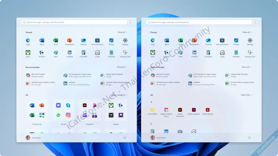 Start Menu แบบใหม่สามารถตั้งค่าให้แสดง All Apps ได้สองแบบคือ แสดงตามหมวด (category) หรือ แสดงตามตัวอักษร (grid view) และปรับขนาดของเมนูได้เองตามขนาดหน้าจอ เช่น หน้าจอใหญ่จะเห็น 8 คอลัมน์ ถ้าหน้าจอเล็กลงอาจเหลือ 6 คอลัมน์