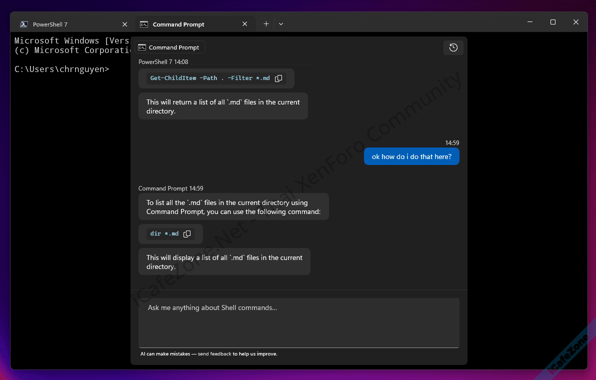 ฟีเจอร์นี้ทำให้เรากดปุ่มลัด (ตั้งเองได้) เพื่อเรียก AI chat ขึ้นมา เบื้องหลังเป็นการคุยกับ AI โมเดล GPT-3.5 Turbo บนเซิร์ฟเวอร์ Azure OpenAI Service เพื่อช่วยตอบคำถามเกี่ยวกับวิธีการใช้งาน Terminal เช่น การเขียน shellscript แบบต่างๆ