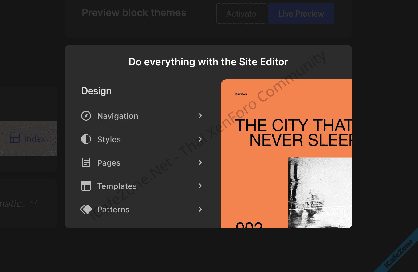 - Site Editor แสดงพรีวิวธีมของบล็อคก่อนเปลี่ยนธีมจริงๆ และปรับแก้ก่อนเปิดใช้ธีมได้