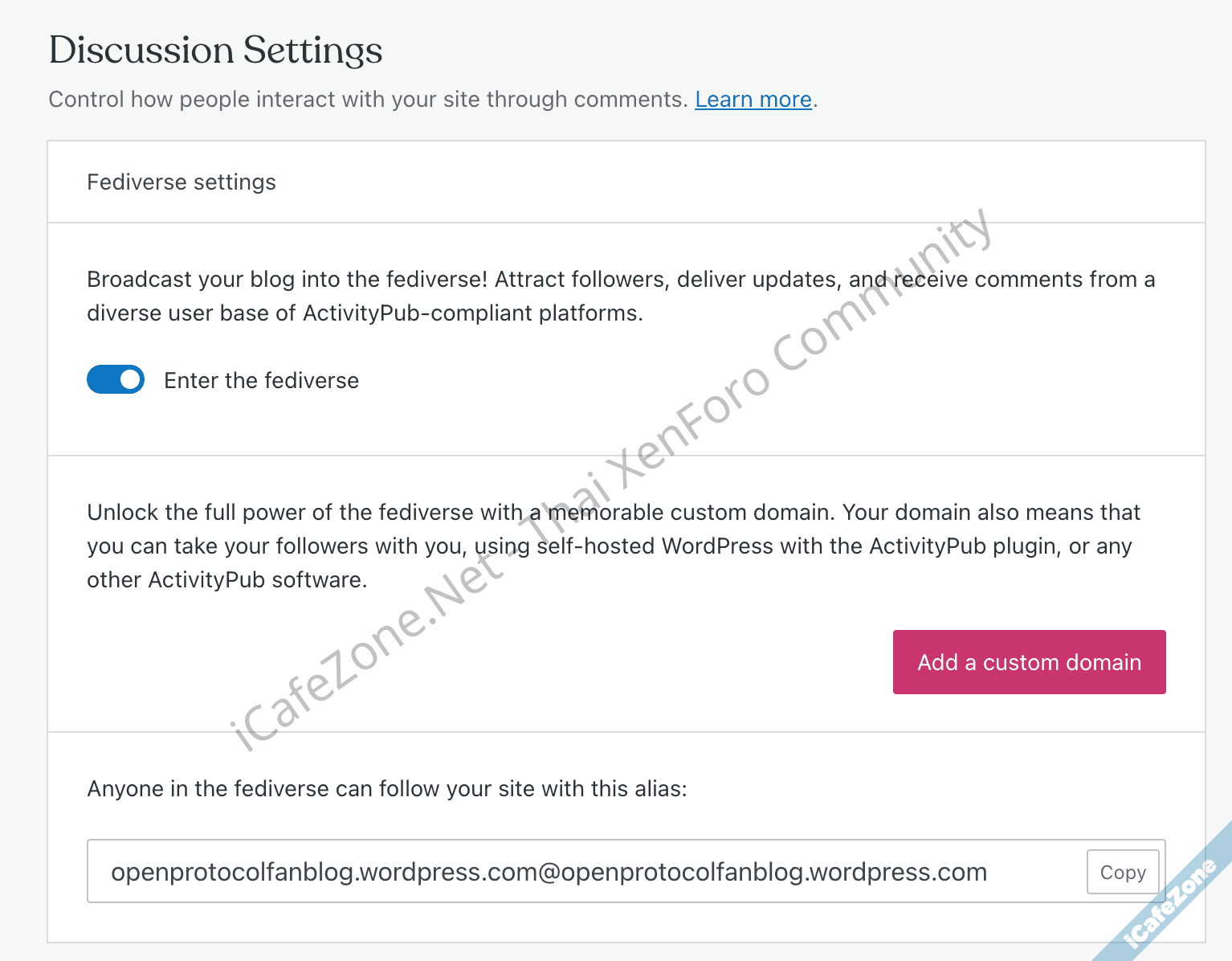 วิธีการใช้งานต้องไปเปิดใน Settings > Discussion > Fediverse ก่อน ซึ่งเราจะได้บัญชีชื่อ [email protected] มาใช้งาน หากเรามีโดเมนเนมของตัวเอง (custom domain) ก็สามารถนำมาเป็นโพรไฟล์ที่สั้นและจดจำง่ายขึ้นได้