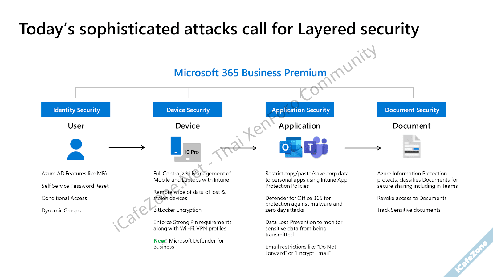 โซลูชัน Microsoft 365 Business Premium ที่รวมแอป Office พร้อมกับบริการ Cloud ที่มีประสิทธิภาพและการรักษาความปลอดภัยที่ครอบคลุมซึ่งจะช่วยปกป้องธุรกิจจากภัยคุกคามไซเบอร์ขั้นสูง ทั้ง Azure Active Directory Premium, Microsoft Purview Information Protection, Microsoft Intune, Microsoft Defender for Office 365, Microsoft Defender for Business ให้บริษัทสามารถทำงานแบบ Work from Anywhere ได้โดยไม่ต้องกังวลต่อภัยไซเบอร์ ข้อมูลสูญหาย หรือรั่วไหล