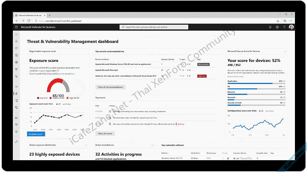 - Microsoft Defender for Business ป้องกันภัยไวรัสและมัลแวร์ (Next-generation antivirus protection) พร้อมกลไกสำคัญต่อสู้กับภัยคุกคามใหม่ ๆ ทั้ง Endpoint detection and response (EDR) การตรวจสอบซอฟต์แวร์ที่ติดตั้งในเครื่อง ช่องโหว่และความเสี่ยง (Threat and vulnerability management)