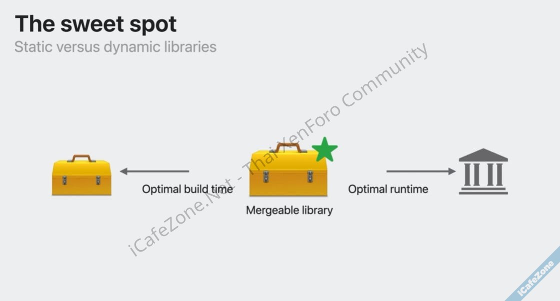 mergeable library พยายามเสนอแนวทางตรงกลาง โดยไลบรารีจะมาพร้อมกับ metadata สำหรับการ link แต่ในช่วงเวลา build ตัว Xcoce จะสามารถออปติไมซ์ล่วงหน้า ลบข้อมูลที่ไม่จำเป็นสำหรับการรันไบนารีที่ build อยู่