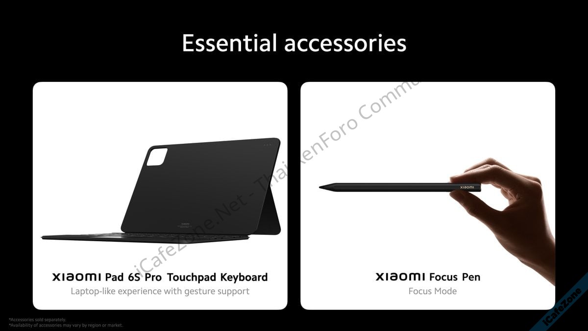 สเปกของ Xiaomi Pad 6S Pro 12.4 ใช้ชิป Snapdragon 8 Gen 2, แบตเตอรี่ขนาด 10000mAh ชาร์จเร็ว 120W, กล้องหลัง 50MP, กล้องหน้า 32MP, รองรับ Wi-Fi 7, ลำโพง 6 ตัวรองรับ Dolby Atmos, สตอเรจขนาด 8GB+256GB / 12GB+512GB, ตัวเครื่องหนัก 590 กรัม มีอุปกรณ์เสริมเป็นปากกา Xiaomi Focus Pen และคีย์บอร์ด Xiaomi Pad 6S Pro Touchpad Keyboard