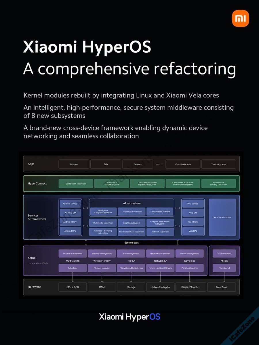 หลายคนอาจสงสัยต่ออยู่ดีว่า การนำเคอร์เนล 2 ระบบปฏิบัติการมารวมกันมันทำได้จริงๆ หรือ เรื่องนี้ Xiaomi ยังไม่ตอบตรงๆ สิ่งที่พออธิบายได้ดีที่สุดในขณะนี้คือ Lei Jun ซีอีโอได้โพสต์โชว์แผนภาพสถาปัตยกรรมของ HyperOS โดยส่วนของ Kernel เขียนไว้ว่า Linux + Xiaomi Vela ดังภาพ (ซึ่งก็ยังไม่ตอบคำถามอยู่ดี)