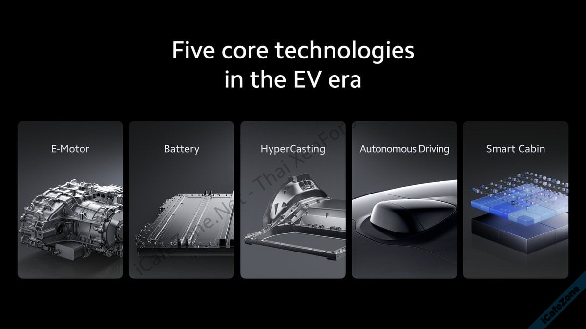 Xiaomi บอกว่ารถยนต์ไฟฟ้ามาพร้อม 5 เทคโนโลยีที่เป็นหัวใจสำคัญของ EV ยุคหน้า ได้แก่ E-Motor ด้วยเทคโนโลยีเครื่องยนต์ HyperEngine, แบตเตอรีแบบ CTB ที่ต่อกับโครงสร้างของรถยนต์, โครงสร้างตัวรถ Hypercasting, ระบบขับเคลื่อนอัตโนมัติ และ Smart Cabin ที่ทำงานบนระบบปฏิบัติการ HyperOS
