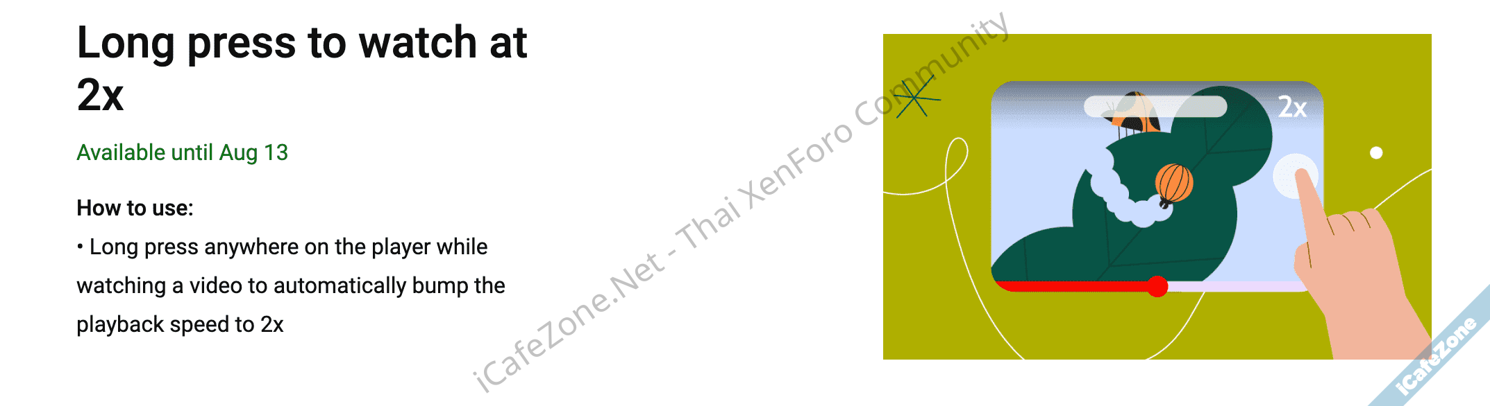 ทาง YouTube เลยเพิ่มการทดสอบทางลัด "Long press to watch at 2x" สามารถทำได้โดยการ กดค้างไว้ที่หน้าจอส่วนใดก็ได้บนหน้าจอ วิดีโอก็เพิ่มความเร็วเป็น 2X ให้อัติโนมัติ พร้อมขึ้นข้อความโชว์ “Playing at 2x speed” ในตอนนี้ฟีเจอร์นี้เปิดทดสอบสำหรับสมาชิก YouTube Premium จนถึงวันที่ 13 สิงหาคม 2023 เท่านั้น
