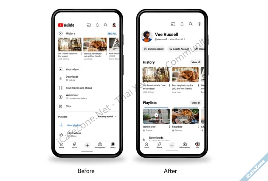YouTube ประกาศฟีเจอร์ชุดใหญ่ให้แอพเวอร์ชันมือถือ เริ่มจากการปรับแท็บด้านขวาล่างสุดที่เดิมชื่อ Library โดยรวมกับโพรไฟล์ของเราที่อยู่ขวาบน มาเป็นแท็บใหม่ชื่อ You รวมทั้งประวัติการรับชม (History), รายการเล่น (Playlists), รายการดาวน์โหลด (Downloads) ใช้ดีไซน์ใหม่ที่หาวิดีโอง่ายขึ้นกว่าของเดิม